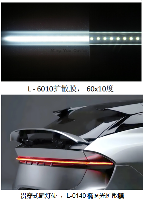 明悦光学的L系列椭圆光扩散膜在贯穿式尾灯中发挥着重要作用,通过将线性排布的高亮LED水平拉伸,有效消除LED颗粒感,转换为无亮点的均匀发光条。同时,这种扩散膜在垂直方向不增加扩散角度,从而保持尾灯的亮度。这不仅提升了车辆的美观性,还增强了行车安全性,特别适用于对设计感和功能性要求较高的现代汽车贯穿式尾灯灯。