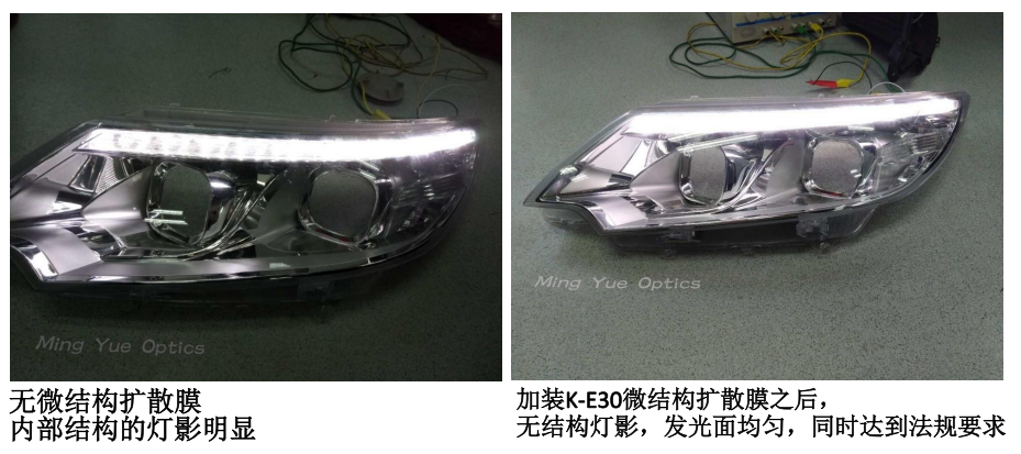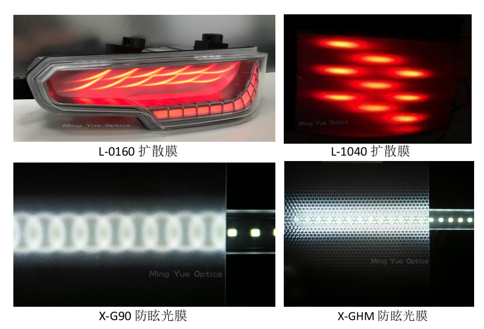 明悦光学的微结构膜在汽车尾灯和位置灯中主要用于实现LED亮点遮蔽,通过其核心产品K-系列双面微结构扩散膜(如K-H80、K-H90)达成以下效果: