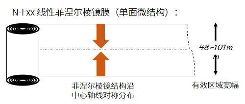 N-F系列线性菲涅尔棱镜膜具有中心对称性,在线性灯具使用时需要将棱镜膜的中心轴线对准线性光源。模切时也要注意沿菲涅尔棱镜膜的中心轴取料。