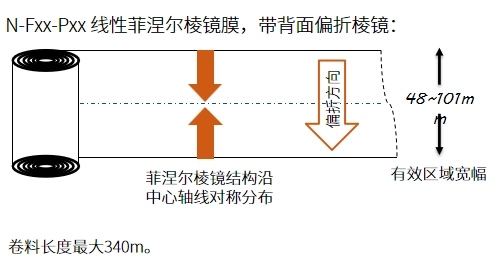 ● N-F系列菲涅尔棱镜膜为连续卷料,每种型号的宽幅不同,请见产品列表。